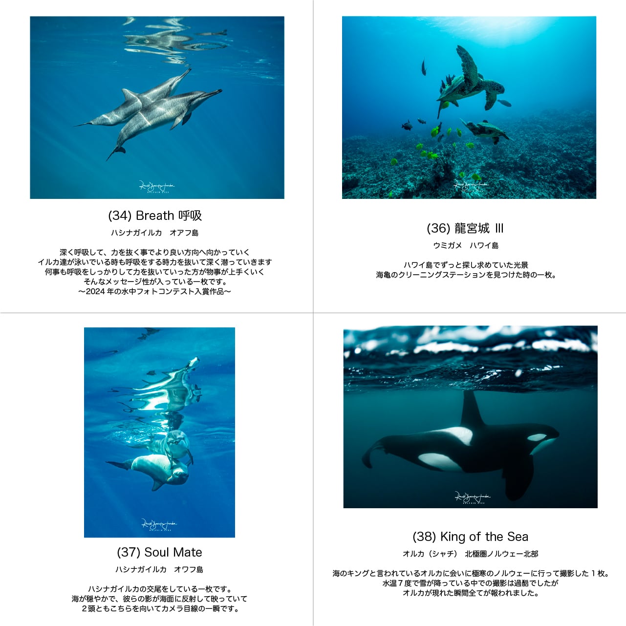 Ronald Daisuke氏が世界中で捉えた愛らしく美しい姿のイルカやクジラの感動の瞬間をお楽しみいただけます。全54作品の中からお気に入りの一枚をセレクトし、癒しの時間をお楽しみください。