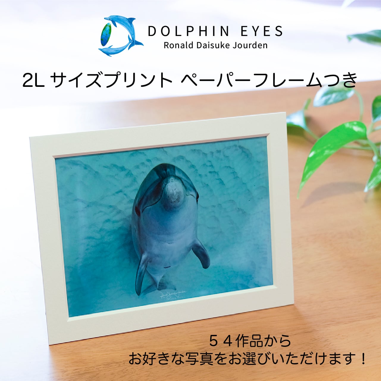 DOLPHIN EYES/ Ronald Daisuke Jourden が贈る、美しいイルカやクジラの水中写真を、2Lサイズにプリントし、ペーパーフレーム付きでお届けします。日々の生活に、癒しの瞬間を加える特別なアイテムです。