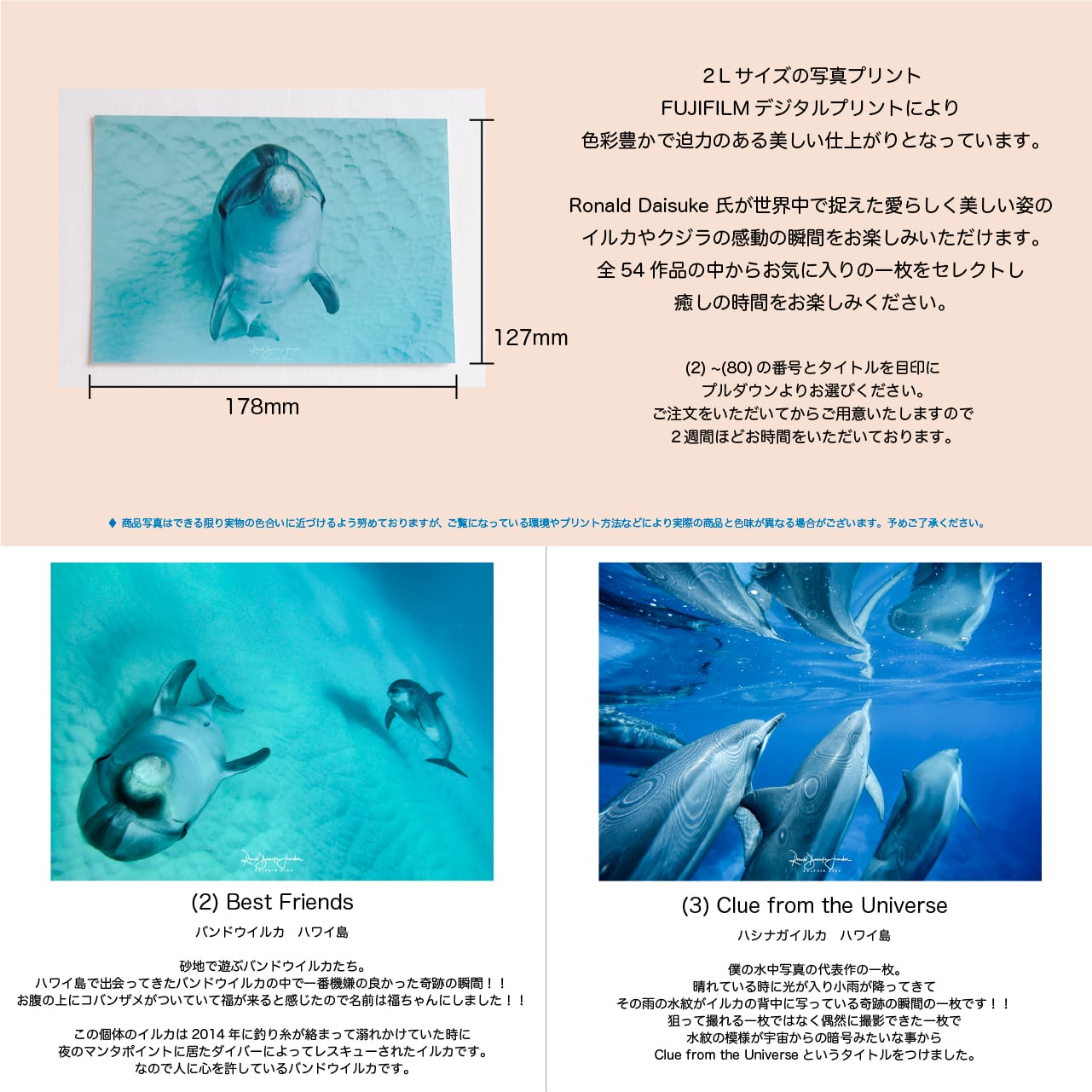 DOLPHIN EYES/ Ronald Daisuke Jourden が贈る、愛らしいイルカやクジラの水中写真を 2Lサイズの写真プリントにしてお届けします。日々の生活に癒しの瞬間を加える特別なアイテムです。