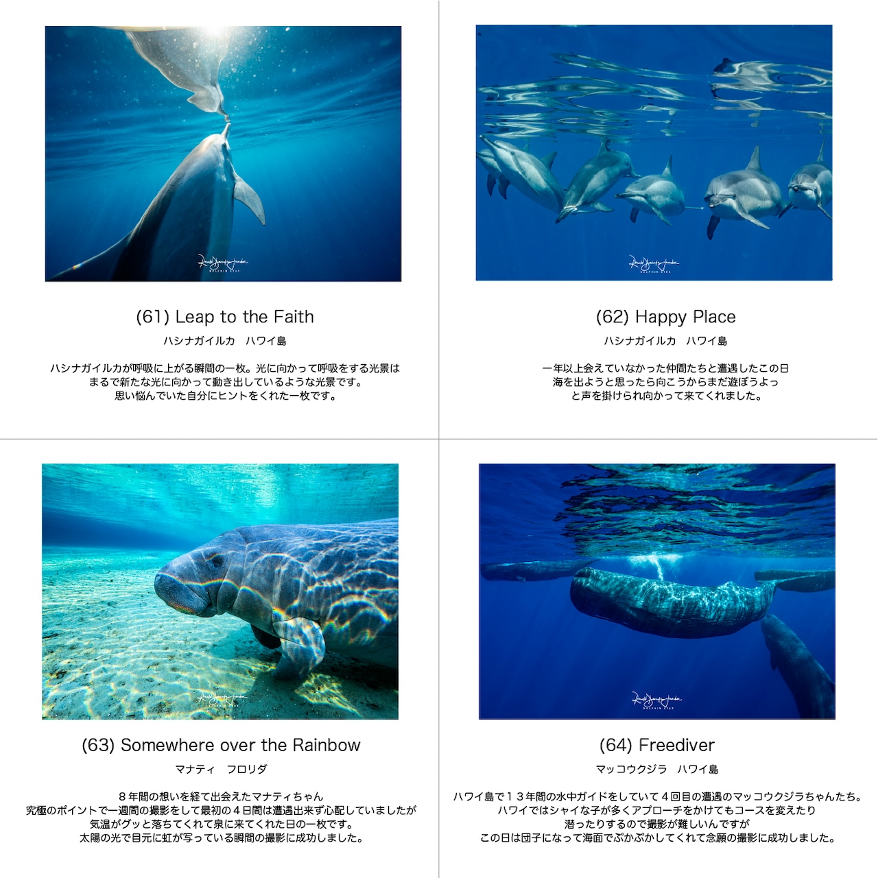 Ronald Daisuke氏が世界中で捉えた愛らしく美しい姿のイルカやクジラの感動の瞬間をお楽しみいただけます。全54作品の中からお気に入りの一枚を選んで、あなたの心を癒す時間をお楽しみください。